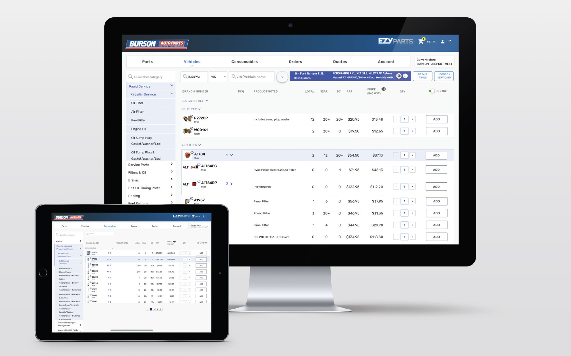 Burson EzyParts is Burson's Online parts ordering solution available for trade account customers so you can order parts without picking up the phone, saving you time, effort and money in your workshop. EzyParts gives you access to Burson's huge inventory and vehicle catalogue system all at your fingertips. You can search by a specific vehicle or by a part type, bring up an image and dimension information to confirm it's what you're after, with your pricing on the spot.
