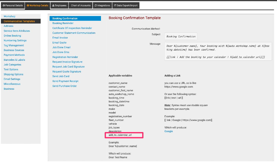 We have added a function to the booking confirmation template that allows customers to add their booking into their Google or Apple Calendar. If you go to Settings -> Workshop Details -> Communication template you will see a new variable available to add to the this message. Add this into your message or via the link syntax.